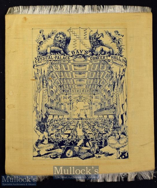 Birmingham - Day’s Crystal Palace of Varieties, In Small brook Street Beautiful Double Sided Silk Souvenir Programme 21st December 1886 Grand special Performance being the 24th Anniversary of this Magnificent Hall. Large bill of 31 different acts Including Vesta Tilly and Harry Randall then great stars of the Music Hall Obverse; Detailing with listing the Acts etc. The reverse has a most magnificent view of the interior of this Concert Hall. Ornately printed in blue, size 9½” x 11½”. (Days Crystal Palace Concert Hall. opened on 18th October 1862. It was sold to Edward Moss of the Moss Empires Ltd, chain in September 1893, and was partially altered to build his new Empire Palace Theatre. The Empire Palace of Varieties opened on 7th May 1894 with Gus Ellen topping the bill. All the top names in music hall and variety played at the Birmingham Empire, including Marie Lloyd and Harry Lauder. The end came abruptly in October 1940, when the Empire Theatre was hit by German bombs, and was left in ruins.)