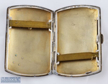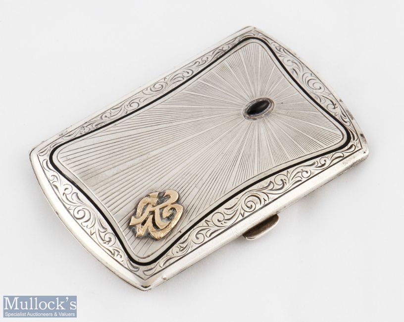1920s / 1930s German .900 Silver Cigarette Case with scroll decorated border with black enamel and black cabochon to lid with gold faced KW monogram, with makers mark WR to inner rim, length 8.5cm, small enamel loss to lid, otherwise good condition with good tight closed fit, weight 68 grams