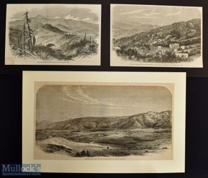India and Punjab – The City of Lahore Original Panoramic Engraving 1857 showing troops with elephant entering the city, measures 43x11cm approx with The Tomb of Runjeet Singh at Lahore 1858 17x15cm approx. and Sketches in the Punjab 1857 25x18cm all mounted (3), plus Three Original Engravings to include Abbotabad one of our Sanitariums in the Himalayas 1863 36x20cm, View of Murree 1863 24x16cm and Simla 1849 24x16cm, all tipped to card (6)