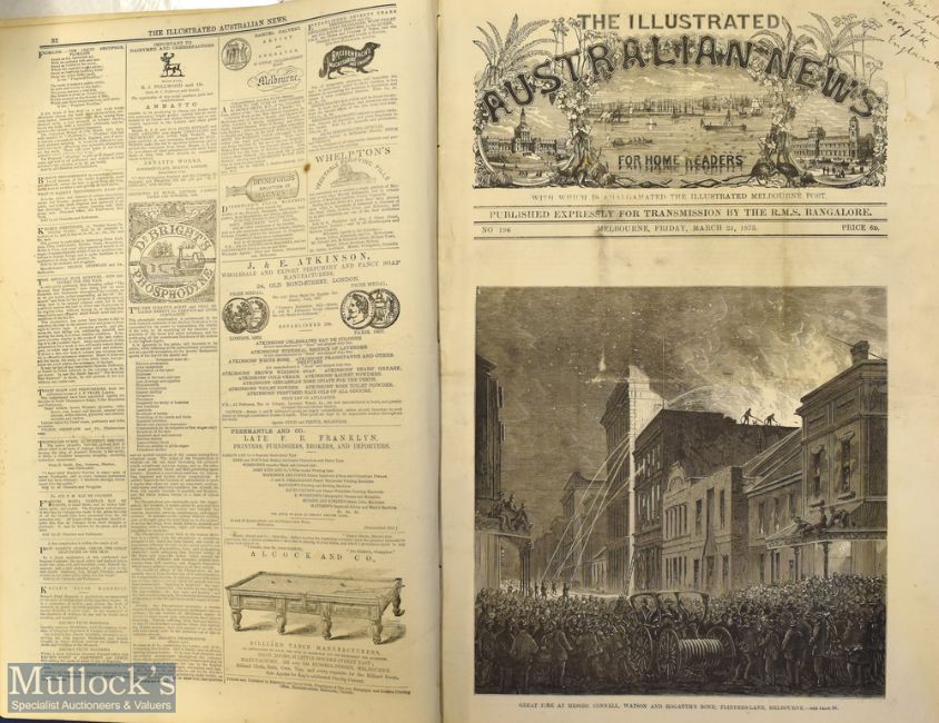 Australian and New Zealand - Scarce Journal – The Illustrated Australian News – For Home Readers Melbourne 1873 Nos 194 to 206, consists of 13 issues and 3 supplements, postally sent with 1 penny green, Victoria State stamp by RMS to an address in Norfolk, UK, bound but covers lacking, previously folded with light wear due to posting, small edge tears, 42x28cm overall. Contains approx. 100 pages of woodblock illustrations including costume cricket match, township of Nelson NZ, Fitzroy iron works, Mount Wellington convict settlement, Hustlers Mine, Sandhurst, North Clunes mine, Stawell Jumpers, Newcastle Harbour, Funeral of a Maori Chief etc