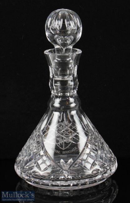 Royal Birkdale Golf Club Engraved Cut Glass Decanter by Stuart with engraved club crest to front with date 1988, height 26cm, makers mark to base, shows signs of use