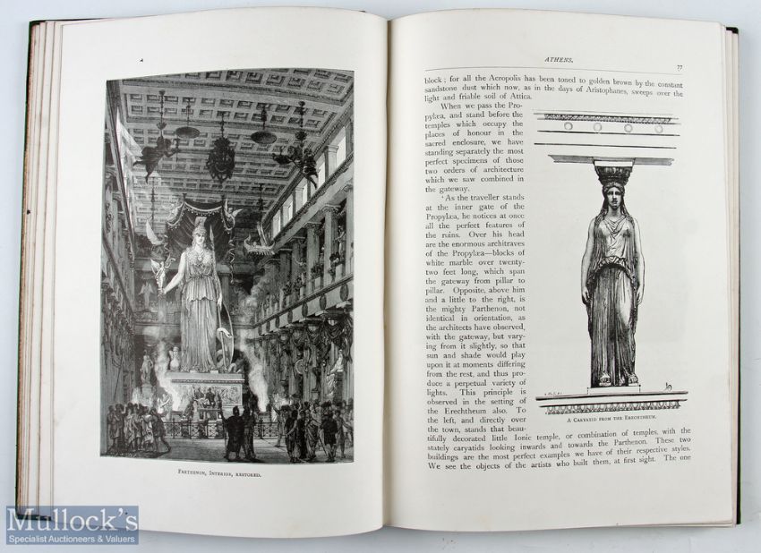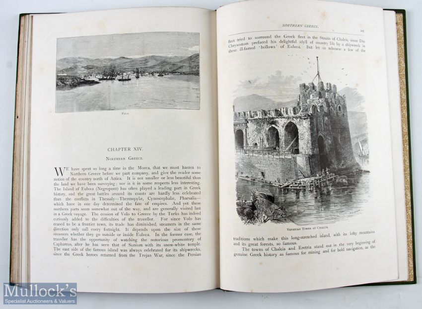 Greece - Greek Pictures Drawn in Pen and Pencil by J.P. Mahaffy MA 1890s a large pictorial 225 page book with some 90 fine engraved illustrations of the scenes in the Towns, Villages. People and impressive ancient Temples etc etc. Green and Gold cloth board cover with fine tooled illustration on front cover. Large book size 8” x 11”