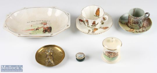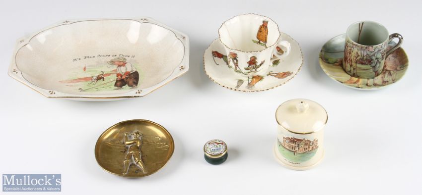 Mixed Golfing Selection – incl Spode Flemish Green coffee cup and saucer with golfer design, Crown Devon St Andrews lidded pot, Staffordshire enamels small pill box, brass dish with relief golfer design (2 small holes within design), early 20th century cup and saucer with golfers design (cup a/f) and a Staffordshire pottery ~It~s Plus Fours as Does It~ bowl (crazed with chips to underside) (6)