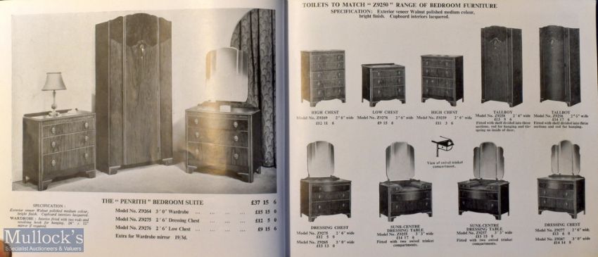 Harris Lebus Ltd, Tottenham, London. Autumn 1954 Trade Catalogue. An extensive Furniture & Upholstery over 130 page catalogue illustrating with photographs mostly in room settings their very extensive home furniture with details and prices. Also panoramic photograph of their extensive Finsbury Works at Tottenham. Printed on semi- gloss paper in card cover size 8” x 6”. (Then the largest furniture manufacturer in the World)