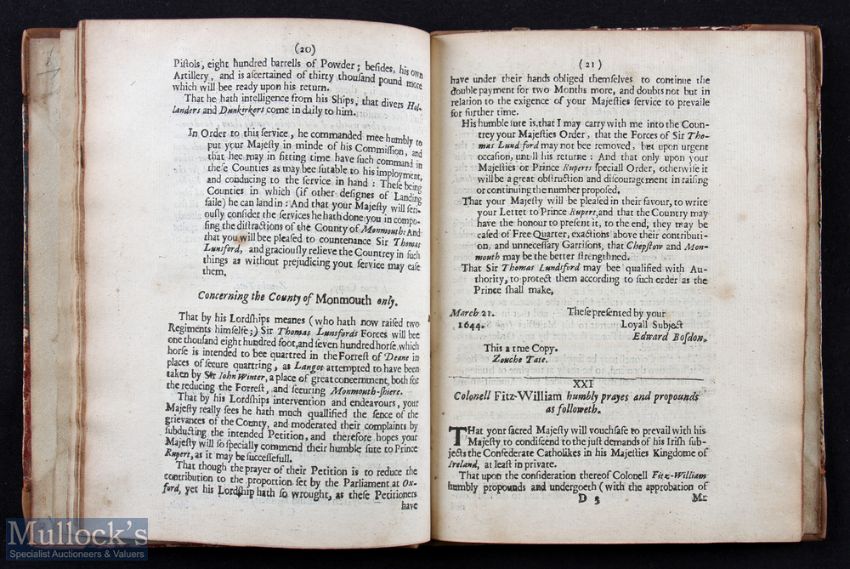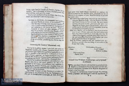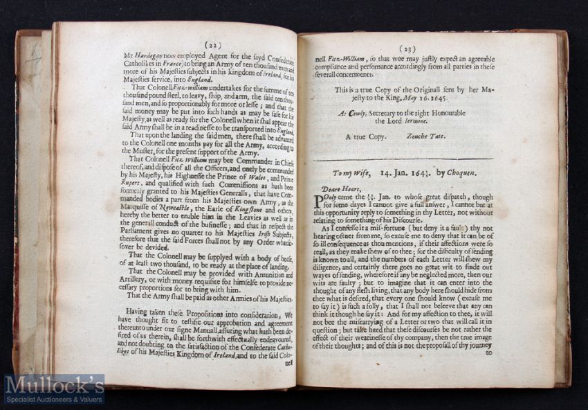 Great Britain – Charles I - English Civil Wars - Important Historical Publication; The Kings Cabinet Opened: Or Certain Packets Of Secret Letters & Papers Written With The Kings Own Hand And Taken In His Cabinet At Nasby-Field June 14. 1645 By Victorious Sr. Thomas Fairfax. A 56 page important historical booklet published by Special Order of Parliament in 1645. The loss of these papers relating to various secret negotiations by the duplicitous King sealed his fate more than the losing the Battle of Nasby. Particularly the letter requesting 10,000 Catholic Soldiers from Ireland, (see letter on pages 22 & 23) In later Marble Board with leather spine, size 5¾” x 7½”