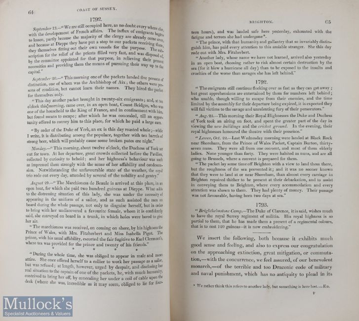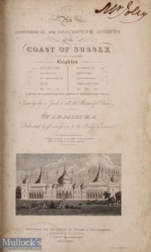 An Historical And Descriptive Account Of The Coast Of Sussex by J.D. Parry, MA 1833 - First Edition. Published in Brighton. A fine 435 page book with 6 full page plates and fold out map plus 2 illustrations as well. The book is mostly about Brighton, but giving an interesting account about other towns and villages in Sussex including Arundel, Chichester, Lewes etc. In cloth board binding, but with expensive leather ribbed and gold tooled spine, size 6” x 9”.