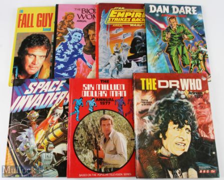 7 Assorted Annuals incl The Fall Guy, The Bionic Woman, The Empire Strikes Back, Dan Dare 1991, Space Invaders 1983, Six Million Dollar Man and Dr Who 1977 (7)