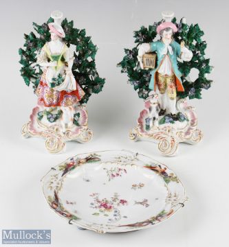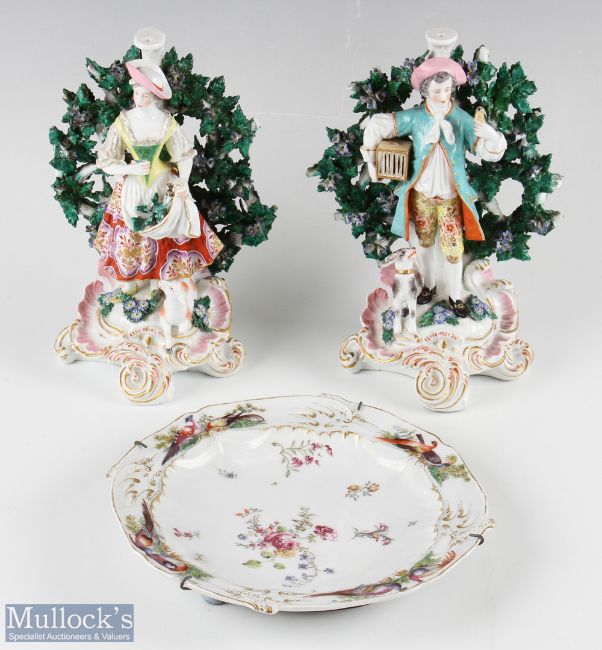 Pair of 19th century Sampson after Derby Figures one of a man holding bird cage with a dog and the other of a woman with lamb, both having floral foliage backs on scroll bases, with gold anchor marks to rears, height 23cm, together with a Sampson plate with bird and floral design with painted gold anchor mark to underside. (3)
