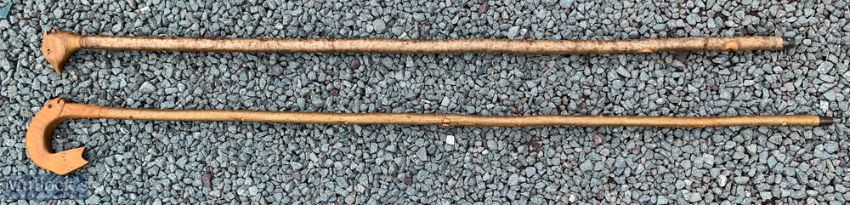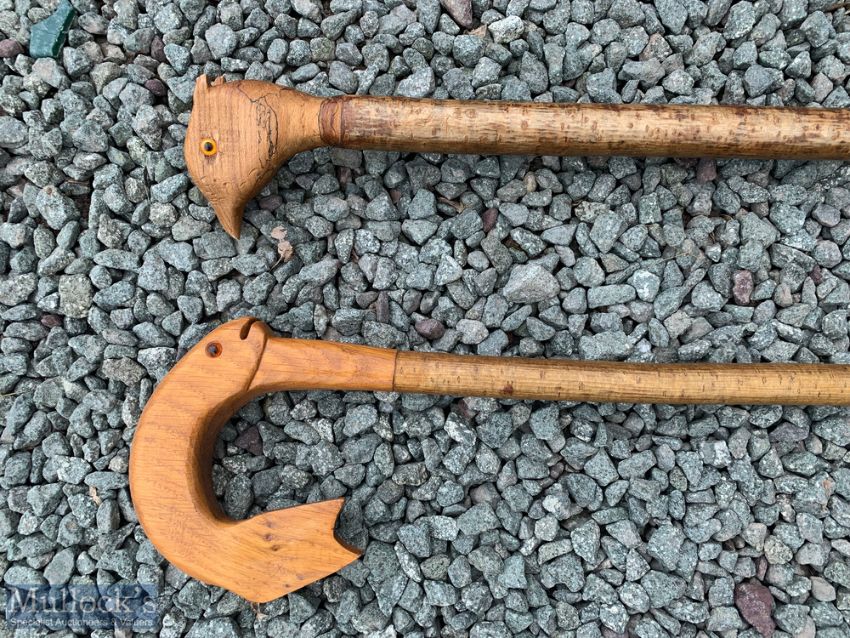 2 Animal Carved Crooks / Walking Poles one with fish design, the other with bird head, longest 141cm