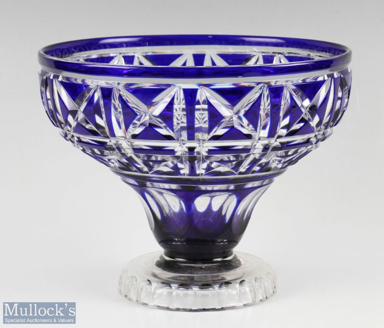 Vintage Blue Flash Cut Glass bowl with flared shaped bowl on clear foot, height 18cm
