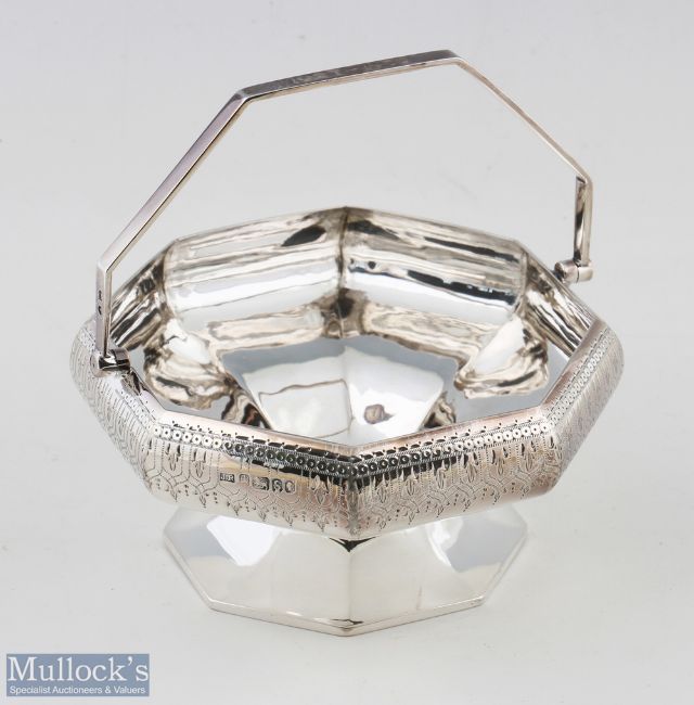 Victorian Hallmarked Silver Octagonal Bon Bon Dish with hinged handle, body with engraved decoration, hallmarked Sheffield 1885 by Joseph Rogers, good overall condition with handle centre engraved ‘1927-1952’, width 12cm, weight 170 grams