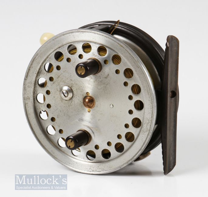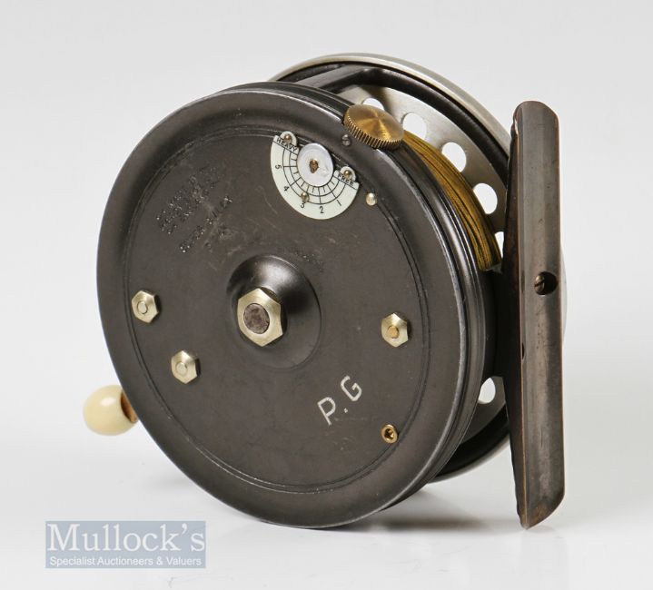 Hardy Bros Super Silex 3 ¾” Alloy Casting Reel with twin black handles, rim tension regulator with half-moon scale, ribbed brass foot, has initials PG engraved to rear, runs smooth