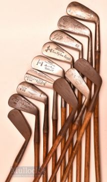 12x assorted irons – mostly long and mid irons Staynorus L model Stepped down no. 2 iron (split to shaft), Stewart Burns Cruden Bay no.2 iron, another by Spalding, another by Jack Randall Sundridge Park, Parker Long iron et al - 2x with bent shafts and 9 with grips