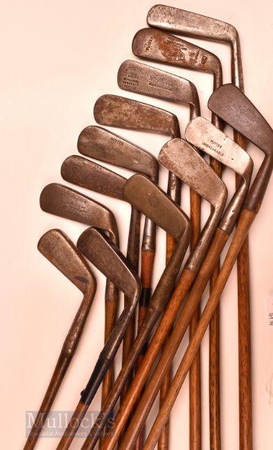 13x various metal blade putters – Imperial long blade, W Parker Carnoustie Royal Brand, Jack Clucas Bridlington, Columbia Special Round back, Anders & Son Centraject straight blade, Gibson Kinghorn wry neck, Anderson Anstruther early brass blade et al - one with a bowed shaft and 11x with grips – all need attention.