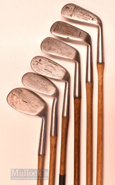 Selection of 6x good bright irons – Joe Anderson Perth Quiksite Super Mashie with notched top line aiming mark, Geo Nicoll “Henry Cotton Langley Park” chamfered back no. 3 iron, Winton oval head No.1 mashie, Standard small head niblick and F H Ayres large head niblick with slight shaft bend – all with good grip
