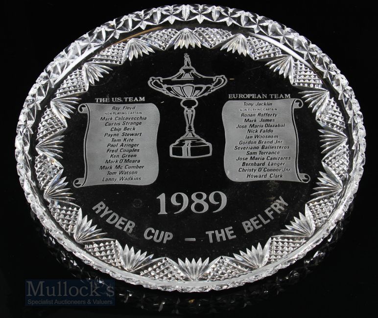 1989 Ryder Cup Cut Crystal Presentation Salver given by the PGA to the players with etched list of both teams with central trophy design with date, diameter 35cm. Provenance: This item has been consigned to sale from Gordon Brand Jnr’s family.