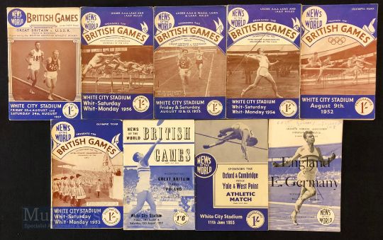 Selection of 1950s ‘News of the World British Games’ Athletics Programmes features 52, 54, 55, 56, and 56 plus 59 Great Britain v Poland, 59 England v E. Germany, 55 Oxford & Cambridge v Yale & West Point – all at White City Stadium, general condition appears A/G (9)