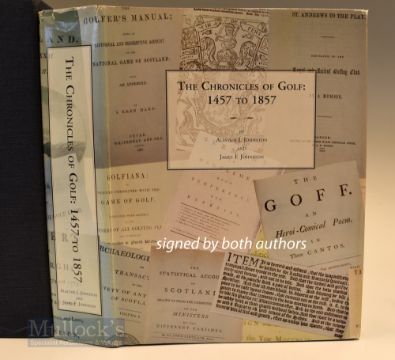 Johnston Alastair J & Johnston James F – signed - “The Chronicles of Golf: 1457 to 1857” 1st ed 1993 and signed by both authors to the limitation page - ltd ed. no.332/900 complete with the original D/J and blue cloth slipcase (small split along one edge)with laid down colour print of The Grand Match - 734 pp. Illustrated with 48 plates from photographs, paintings, drawings, facsimiles, engravings, maps, etc., most of which are in colour; map endpapers showing the early golfing locations in Scotland – some minor marks to the dust jacket otherwise overall (G). Note The most comprehensive study of early literary references on golf and already scarce book. Note From The David Easby Estate
