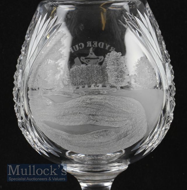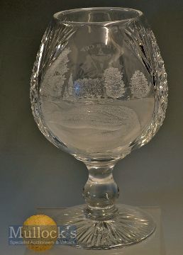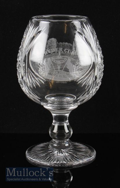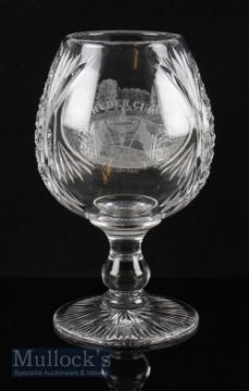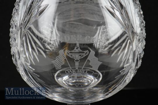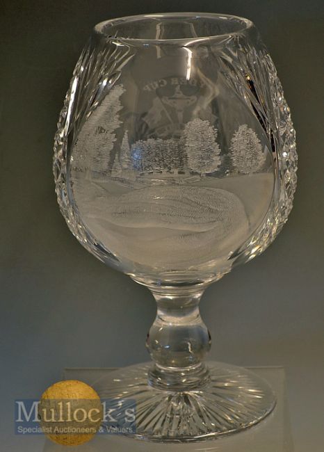 1995 Ryder Cup Large Presentation Waterford Cut Glass Brandy Goblet – beautifully etched with a view of the 18th Hole -played at Oak Hill Country Club USA – with Europe regaining the Trophy and winning for only the 2nd time on US soil – Captained by Bernard Gallacher – overall 10”h x 5” dia base– quite stunning. Note – The above is a special one off Ryder Cup Golf Items given by either The US PGA or The PGA to Players and Officials Only – quite unique item