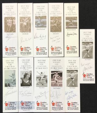 Selection of Olympic and Athletics Autographs featuring Peter Radford, Mary Rand, Alan Simpson, Ann Packer (x2), Judy Grinham, Lynn Davies, Chris Carter, Menzies Campbell, Robbie Brightwell, and John Boulter all inscribed to bookmarks, in ink and appear clear signatures below print depicting the athlete (11)