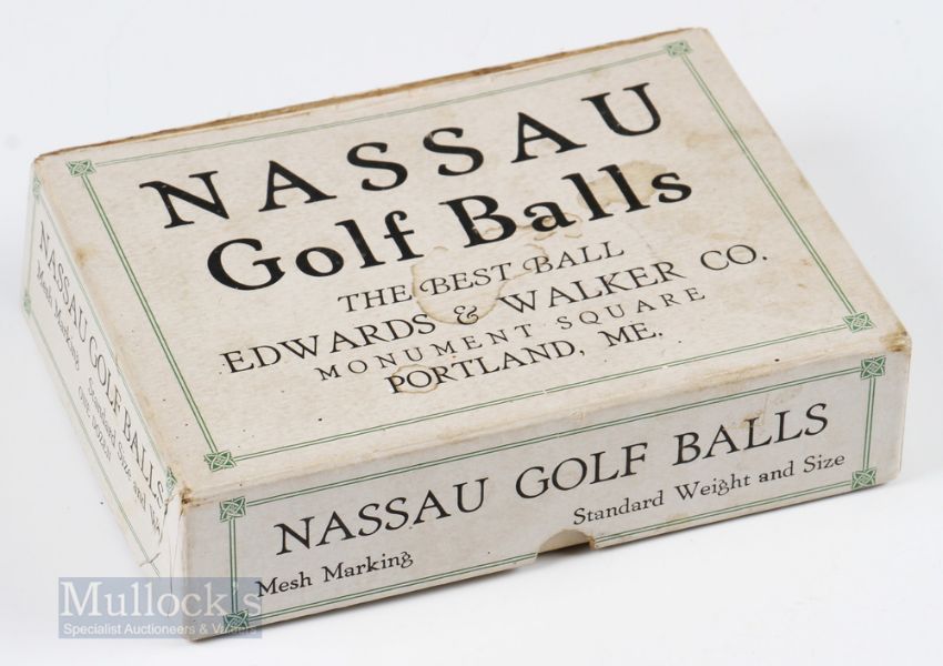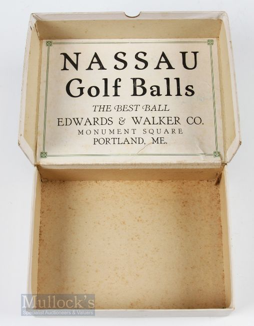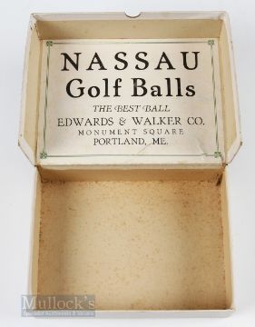 Scarce Edwards ad Walker Co Portland ME, Nassau Golf Ball Box for 12- described as mesh pattern standard weight and size golf balls c/w hinged lid with makers label inside the lid –  hinged card split but still held in place by the original cloth tape otherwise (VG) Note From The David Easby Estate