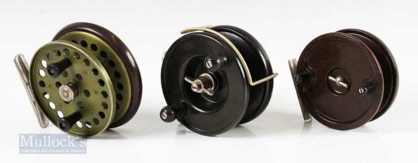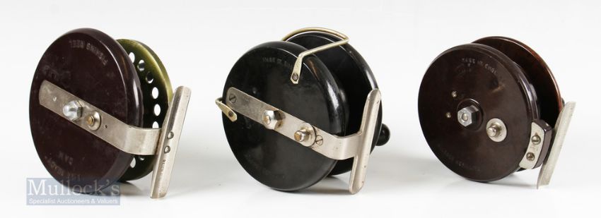 Allcock Aerialite 4” Bakelite wide drum centrepin reel twin handle, bickerdyke line guide, together with an Allcock Aerialite 3 ¾” bakelite centrepin reel with twin handle and a DAM Ever Ready 3 ¾” alloy and bakelite centrepin reel twin handle, pillar drum core – all appear to run smooth with light or very light surface wear (3)