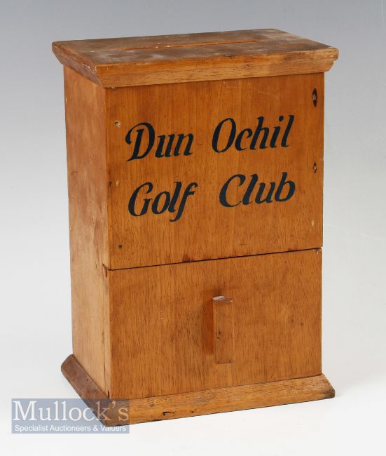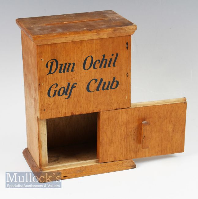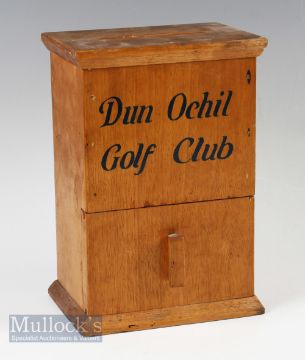 Interesting Dun Ochil Golf Club (Gleneagles) wooden score card box – c/w card slot to the top and front sliding door overall 10.25” x 7” x 5”. Note: Dun Ochil Golf Club was formed by a group of golf members at Gleneagles in 1964 for their members play on all three of the excellent 18 hole courses at this world class resort incl PGA Centenary Course venue of the 2014 Ryder Cup. Note From The David Easby Estate