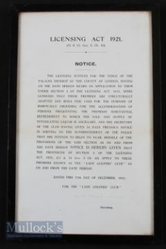 1921 “Lady Golfers Club” Palace Division of The County of London Official Certificate to Serve Drinks – granted under The Licensing Act 1921 - dated 13th December 1921 signed by the Secretary M.M Macfarlane – mf&g 13.5 x 8.5”. Note From The David Easby Estate