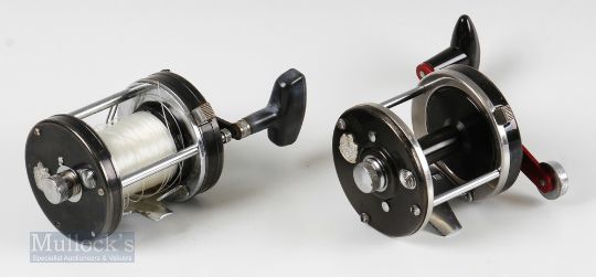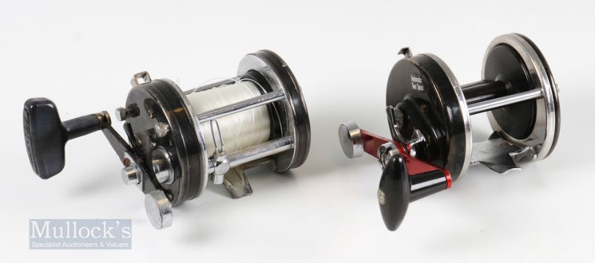 2x Abu Ambassadeur Multiplier Reels – 9000C with red handle having slight bend and 7000C with line guide, both in black and chrome finish, run smooth with signs of wear and use (2)