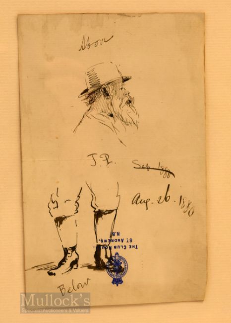 Thomas, Hodge (b.1827 – d.1907) - St Andrews Personality pen and ink sketch of “J P” (John Penn) titled Above and Below dated 26th Aug 1880 on The R&A The Club House St Andrews headed paper – image 7” x 4.5” – overall 15.5” x 11.5”. Note: John Penn born 1848 was MP for Lewisham from 1891 list death in 1903. As well as playing St Andrews he was a prolific medal winner at the North Berwick Links taking the gold medal there in 1895 –for further reference see the book by Harry Langton on Thomas Hodge p.92. Note From The David Easby Estate