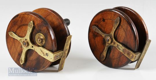 Milwards stamped wood and brass star back 4 ½” centre pin reel with brass rear flange and lining, twin handle, on/off check, spins ok, plus an unnamed 4 ½” wooden and brass star back reel with check mechanism removed, twin handle (2)