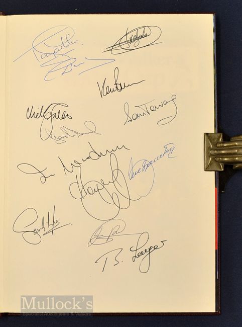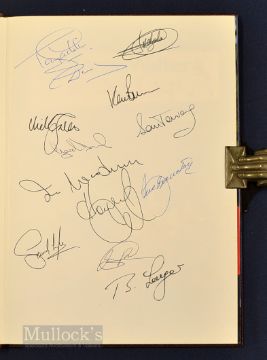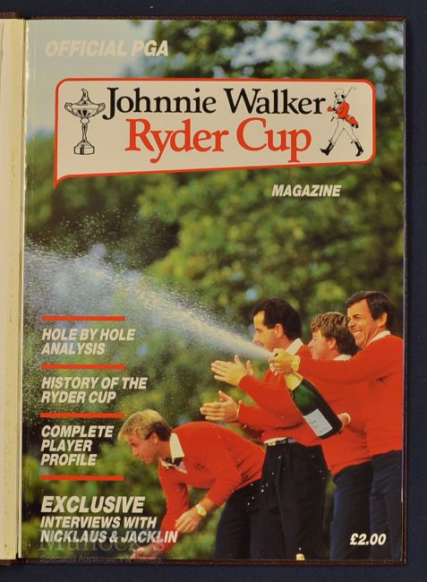 Rare 1987 Ryder Cup Golf VIP Signed Programme - held at The Muirfield Village Golf Club, Ohio and signed by European team who won for the first time on US soil as well as their second consecutive victory with US team losing for the first time on home soil for over 60 yrs – bound in faux leather and gilt boards – and signed by the entire European team to the front free end plate to incl Tony Jacklin (Capt), Seve Ballesteros, Nick Faldo, Ian Woosnam, Sandy Lyle, Bernhard Langer, Jose Maria Olazabal, Gordon Brand, Eamonn Darcy, Jose Rivero, Howard Clark and Ken Brown – again appears unread (VG)