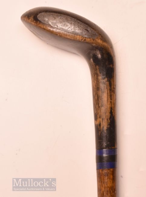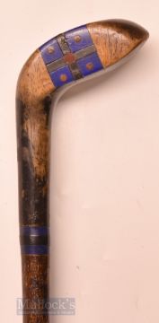 Interesting Early Sunday Golf Walking Stick fitted with persimmon socket head curved sole wood handle with decorative black cross and blue square section central face insert together with matching hosel bands – still retaining the brass tip – overall 33.5”