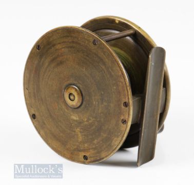 Unnamed brass 3 ¾ plate wind fly reel 4 pillar construction wooden handle single check with light surface wear runs well