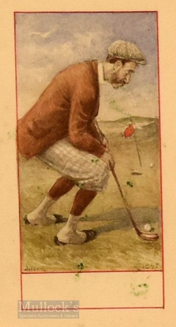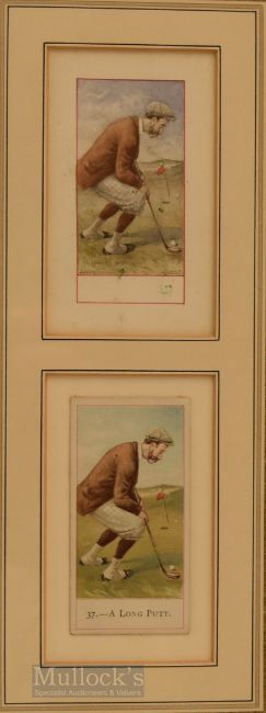 John Wallace (George Pipeshank) “A Long Putt”– rare original artwork for No. 37 of Copes Golfers Cigarette Cards monogrammed lower left and dated 1897 lower right - image 2.75” x 1.25” framed together with the Copes Golfer Original Card No.17 card overall 13.5” x 8.5”. Note From The David Easby Estate