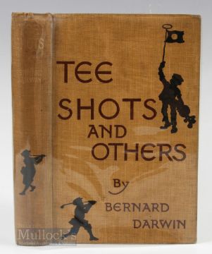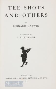 Darwin, Bernard - “Tee Shots and Others” 1st edition 1911 published Keegan Paul, Trench, Trubner & Co Ltd London in the original pictorial and decorative cloth boards and spine (spine slightly faded) illustrated by E.W Mitchell - some discolouration to the front and rear free endplates, both hinges now becoming exposed - otherwise internally clean together with owners name stamped to the front free end plate overall (F) – scarce