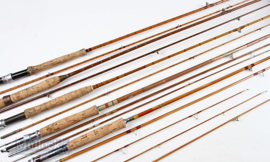 5x Split Cane Fishing Rods – Redpath Co “The Tweed” 8ft 6in 2 piece, tip 3in short, suction joint fittings, Martin James 8ft 2 piece, one ring needs rewhipping, Weiss Fishing Tackle 9ft 3 piece, all complete, Kyoto Rods combination split cane rod, 5ft 3in 2 piece with 2 tips / 7ft 9in 3 piece float rod and Millward “The Lewis” 7ft 2 piece, all rings agate lined with some whipping needing attention, all having cloth bags. (5)