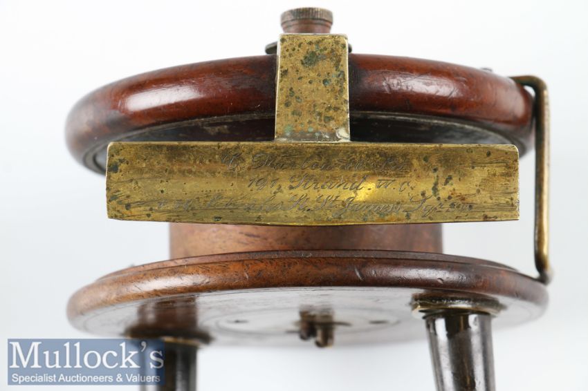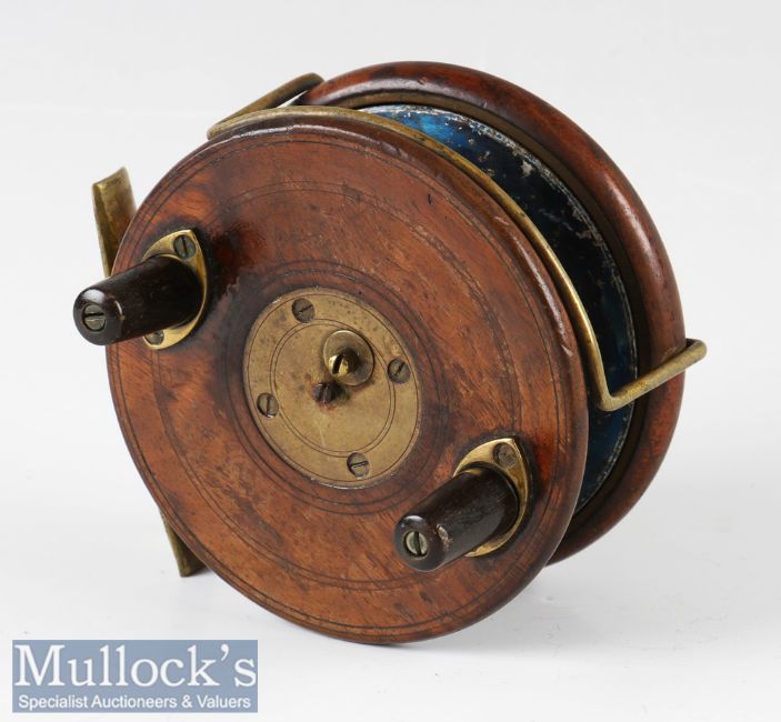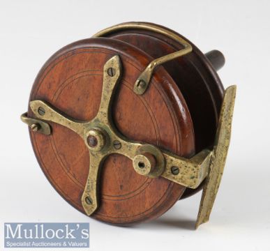 Rare Chas Farlow & Co Ltd, 191 The Strand WC, wooden Nottingham and brass star back reel with makers details engraved along the foot c1895 – 4” dia with brass lined rear drum flange and lined back plate rim – the brass star back stamped "Sun” together and Pat number - overall (G)