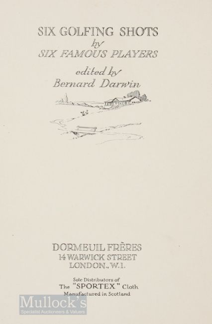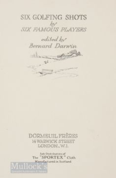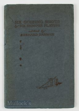Darwin, Bernard (Ed) - “Six Golfing Shots by Six Famous Players” 1st ed 1927 in the original pictorial blue paper wrappers, edges rubbed and thumb stained with illustrations and articles by Abe Mitchell, J H Taylor, James Braid, Arnaud Massy, and James Barnes. Each with facsimile autographs internally very clean c/w full list of Open Championship winners from 1860 (W Park) – 1926 (R T Jones).