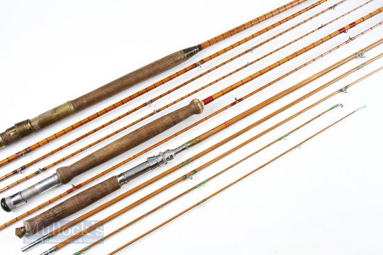 Hardy Split Cane Salmon Rod 12ft 3 piece with brass fittings, red agate lined butt and tip rings, with spare tip shortened by 5in, appears refurbished, with an unnamed split cane fly rod 9ft 2 piece with red agate lined butt and tip rings, tip shortened by 5in and a Japan split cane combination fly rod, 2/3 piece, both tips shortened, all in cloth bags. (3)