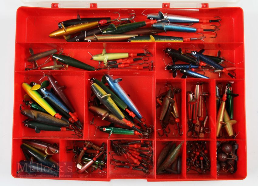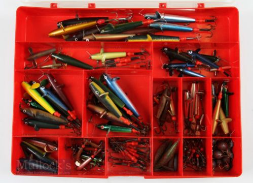Tackle box containing 60 assorted minnows and mounts, metal plastic and alloy examples- with associated accessories