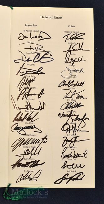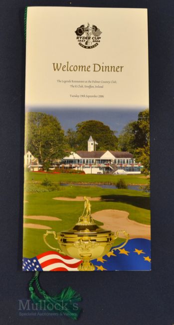 Rare 2006 Ryder Cup Fully Signed Welcome Dinner Menu – played for the first time in Ireland at The K Club and over the Arnold Palmer Designed Golf Course and won for the 3rd consecutive time by Europe equalling their record winning margin of two years earlier – European team Ian Woosnam (Capt), then in alphabet order- Paul Casey, Darren Clark, Luke Donald, Sergio Garcia, Padraig Harrington, David Howell, Robert Karlsson, Paul McGinley, Colin Montgomery, Jose-Maria Olazabal, Henrik Stenson, and Lee Westwood; US team Tom Lehman (Capt), Tiger Woods, Phil Mickelson, Jim Furyk, Chad Campbell, David Toms, Chris DiMarco, Vaughn Taylor, JL Henry, SAC Johnson, Brett Wettrich, Stewart Cink, and Scott Verplank (VG). Note These individual Dinner Menus are from a strictly and exclusive limited edition only distributed post-match between both Teams, their Official Parties and Corporate Partners