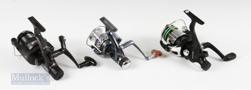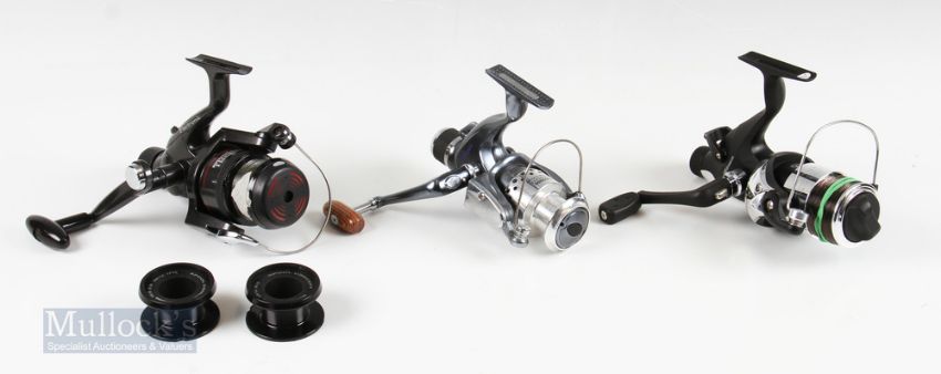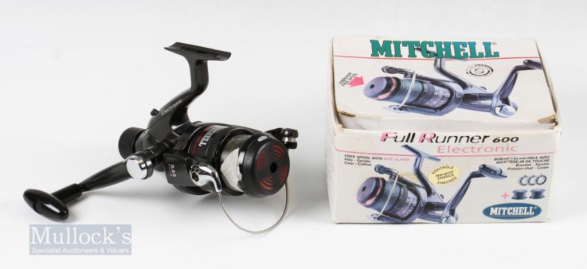 Mitchell Full Runner 600 Electronic Spinning Reel with 2 spare spools in original box, Zero Free Spin 5000 reel and Advance GD3000 reel with wooden handle, all with light use (3)