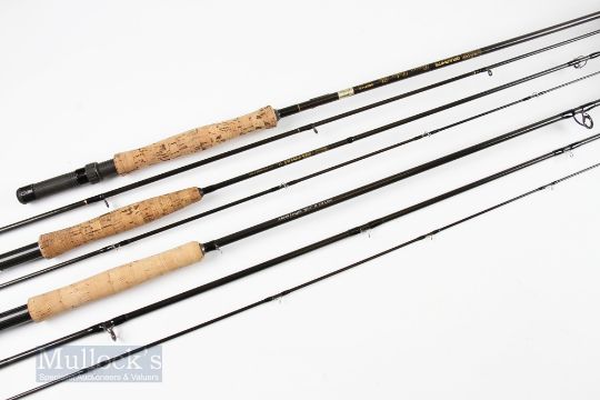 Shakespeare Aerial Hi-Modulus Carbon Fly Rod 2.10m 2 piece, line 4/5# in mcb, Leeda Quick Silver A44028 carbon fly rod, 9ft 6in 3 piece, line 7/8# in cloth bag and a Daiwa Graphite Sensor Delux fly rod SGDF-10, 10ft 2 piece, in cloth bag, all showing light signs of use. (3)
