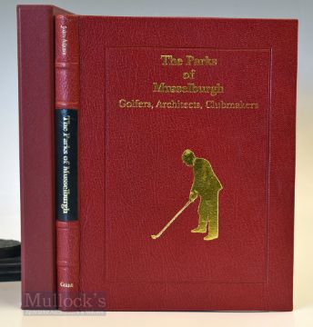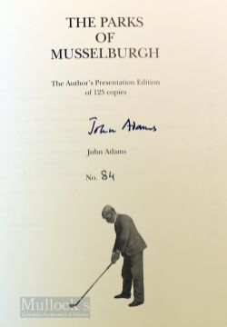Adams, John (Signed) – ‘The Parks of Musselburgh Golfers, Architects, Clubmakers’ – Author’s Presentation Edition no 84/125, Pub’ 1991, in red leather with gold gilt boards, with slipcase – appears in G/VG condition overall, minor wear to covers in places
