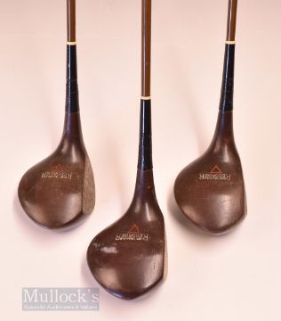 3x matching Pro-Made red triangle recorder persimmon woods – large head woods nos 1(driver), No.2 (Brassie) and No.3 (spoon) - all fitted with central alloy sole plates stamped Made in Scotland – all with full length Kinghorn Tacky perforated leather grips