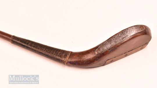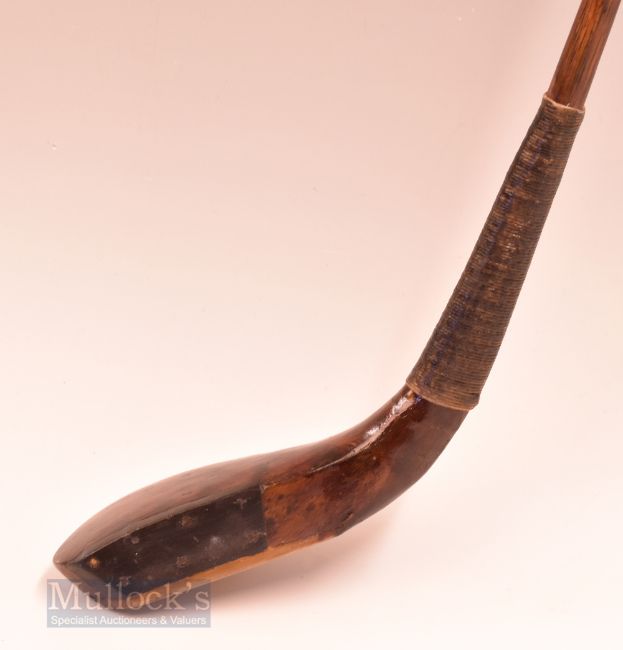 J Anderson St Andrews light stained fruit wood longnose short spoon c1880 – head measures 5.5” x 1 7/8” x 1” deep with a leather face insert from the centre to the toe- overall 39.5” – fitted with full length original hide grip with underlisting – well used club showing signs of restoration. Note From The David Easby Estate