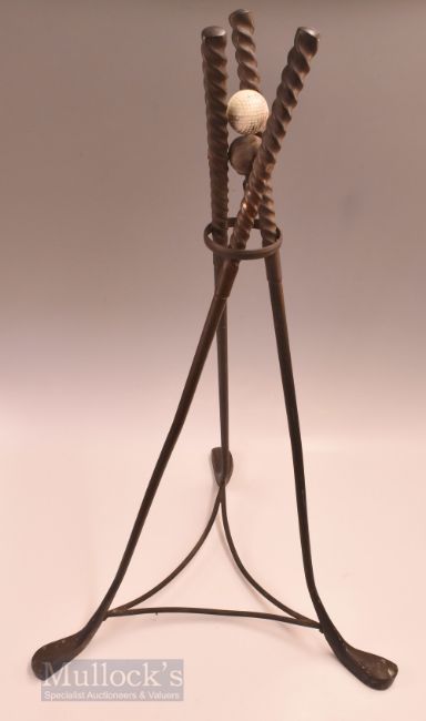 Large Metal Golf Club Pyramid Stand made up with 3x longnose golf clubs c/w square mesh guttie golf ball and suspension ring below for either a vase or flowerpot – overall 38”h x 25” x 25”. Note From The David Easby Estate