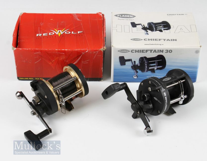 Fladen Chieftain 30 Trolling Reel appears unused with original box, together with Red Wolf Sea 300 trolling reel with light use (2)