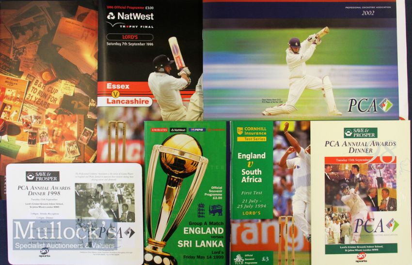 Cricket Mixed Programme and Ticket Selection – incl 1994 England v South Africa first test and ticket, Essex v Lancashire Sept 1996 with team sheet, 1999 World Cup England v Sri Lanka May 14th with ticket, 2002 Benson Hedges Essex v Warwickshire Final at Lords with team sheet, 2002 PCA brochure with test match England v Sri Lanka with 1st June ticket and team sheet and 1998 PCA Awards dinner ticket and menu signed by 2 unknown players